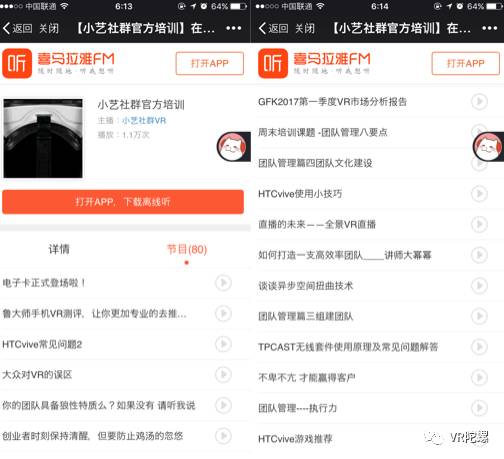 每天晚上,小艺还有线上培训课程发布,这些课程都有固定的方向,比如: 星期一:产品知识的讲解 星期二:如何销售产品 星期三:公司的模式及发展前景 星期四:如何招代理 星期五:VR前景的发展 星期六:疑难问题解答 目前在喜马拉雅FM APP上,小艺社群官方培训专辑中有80个课程。不过VR陀螺听了几节课发现很多都是非常煽动性的鸡汤,要不就是非常基础的VR知识,而主讲人,有时甚至连一句话都读不通顺。(请脑补把insta360按照字母一个个读出来)