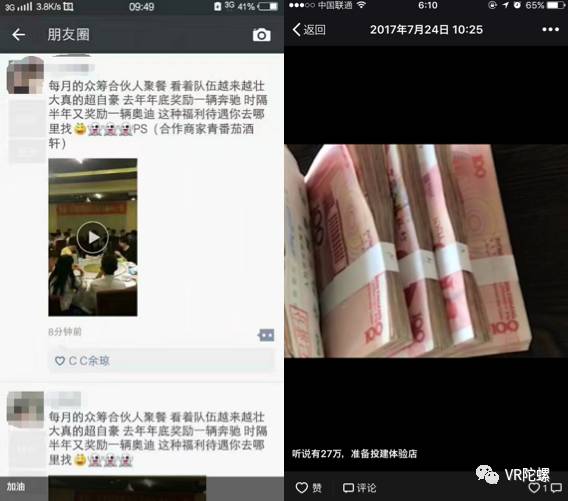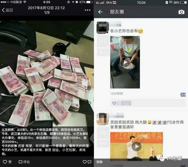 “被骗的80%都是大学生,有的甚至被逼得想跳楼。” “光我身边认识的投资的就有7、8个,还有很多是贷款的,还不上,只能卖命。” “你只要有意见,直接把你踢出去,毛都不给你,让你去告。” “不敢告诉父母,现在家都不敢回,睡觉也是睡公司地板上打地铺。” 学生们跟我诉说着自己的经历。 投资1000块成为分销代理,投资20000元参与众筹成为股东,借着VR和创业的名义,在金钱的诱惑下,很多大学生陷入了泥潭。 4个月前,VR陀螺曾发过一篇“微商、诈骗还是非法集资?揭秘VR硬件和体验店的灰色玩法”,文中揭露了小艺社群的业务模式。成立一年多的小艺社群,靠着这种模式,召集了3000多个代理,120多个投资人,至少敛财700多万。 而近日,这家原本就处于灰色地带的公司,用一年多时间建起来的金字塔,终于从底层开始崩塌。 (当事人保证对VR陀螺提供的所有信息全部属实。为保护个人隐私,文中除了小艺的创始人为真名之外,其他出现的人物均采用化名,如有重名请勿对号入座。)