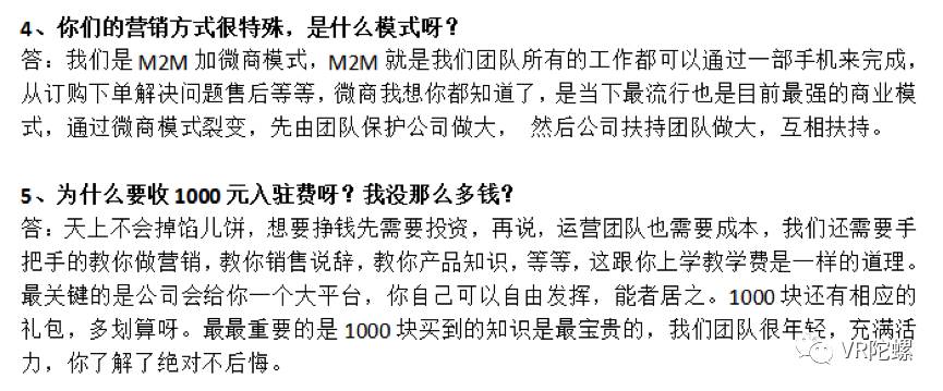 比如在话术模板和创咖必备技能中,从比较基础的“VR是什么?“、“你们是做什么的?”、“怎么加入你们?”到详细的代理模式、营销模式、如何盈利等各种问题都有标准答案。
