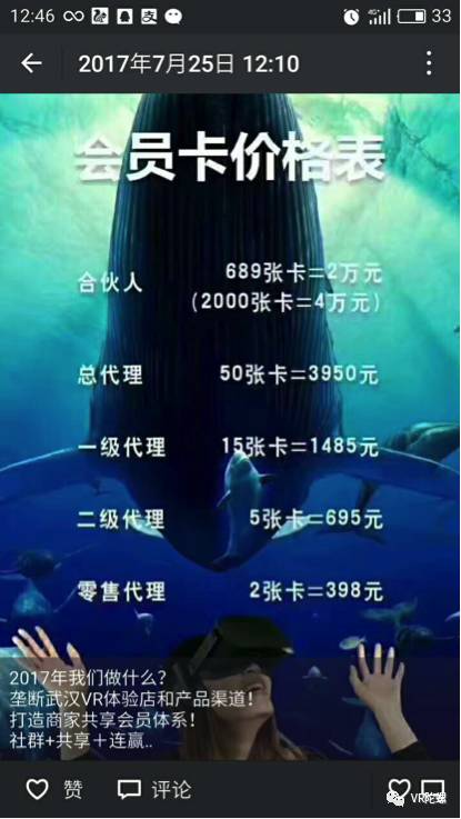 我叫刘文,在襄阳湖北文理学院上学,我是2017年5月份去湖北商贸学院找同学有点事,加了湖北商贸的QQ群,就在群里有一个学姐私发消息给群里每一个人,也给我发了消息,说有没有兴趣了解VR创业项目,聊着聊着就说他们在湖北商贸学院附近有他们的VR体验店,然后就约在中南民族大学附近见面,说带我去湖北商贸附近的VR体验店。 很后我们没在湖北商贸见到VR体验店,就去光谷青年城VR体验店了,带我体验了VR设备,当时就见到了这个团队的负责人王佳,然后就叫我谈谈感受,我第一次接触VR,说觉得体验有意思。 他跟我说了很多项目的好处,勾起了我的兴趣。我问他我可以怎么做,他就说做代理有微店铺,可以卖VR产品,我也是第一次接触这个,就做了他们的VR产品代理。