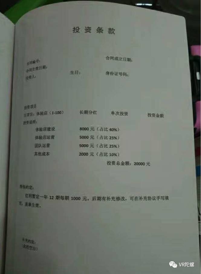 转账全部通过支付宝或者微信渠道,而且所有的人都不是转到对公账户,小艺也没有出具任何发票甚至收据;就一个可作为证据的合同现如今也被收回销毁,学生们手上几乎没有留下任何直接的证据。 而且即使有人把合同拍照下来,VR陀螺在查看过小艺提供的完整的合同后发现,在长达26页的合同中,有17页全部都是鸡汤,美其名曰了解众筹、了解共享经济,通过大量的案例来让这些犹豫中的人给自己接下来要做的事情找个正当的理由。合同其他部分的内容比如投资条款、风险合同、明确说明等,要不就是内容很含糊,要不就是单方面偏向小艺的条款。 比如“投资人应明确知道除投资外,应接受我们的工作请求,投资人无权拒绝,也可调动投资人的工作,如在合作过程中发现合作不愉快,或者彼此有矛盾,我们(指小艺)有权单方面作废本合同并按照现金价值表结算。” 而此时即便有很多人强硬要求小艺退款,几乎得到的都是同样答复,“退款没有,如果一定要请走司法程序”,还有一个选择就是20000元兑换698张线下体验店的年卡,售卡收回成本,但小艺在武汉的线下体验店屈指可数。 很多学生一方面是瞒着父母贷款或者借钱投资,不希望把事情闹大,另一方面碍于自己势单力薄,且手上没有证据,索性把这次经历当成一次教训,忍气吞声;还有一些人还不起贷款,选择了继续在小艺做,继续拉代理。 面对小艺的蛮横,情急之下方杰找李逊理论,在对话中李逊说的两句话让VR陀螺特别在意:“创业是大家的事,为什么要我出钱”、“要我出钱,我要团队做什么呢?”。可见在李逊的思维模式中,团队的人出钱“创业”是理所应当,自己没有兑现作为一个创始人应有的承诺却丝毫无过。 据称,现在小艺已经搬到农庄(用农庄改造成的VR主题公园,在建中),之前的写字楼已人去楼空。
