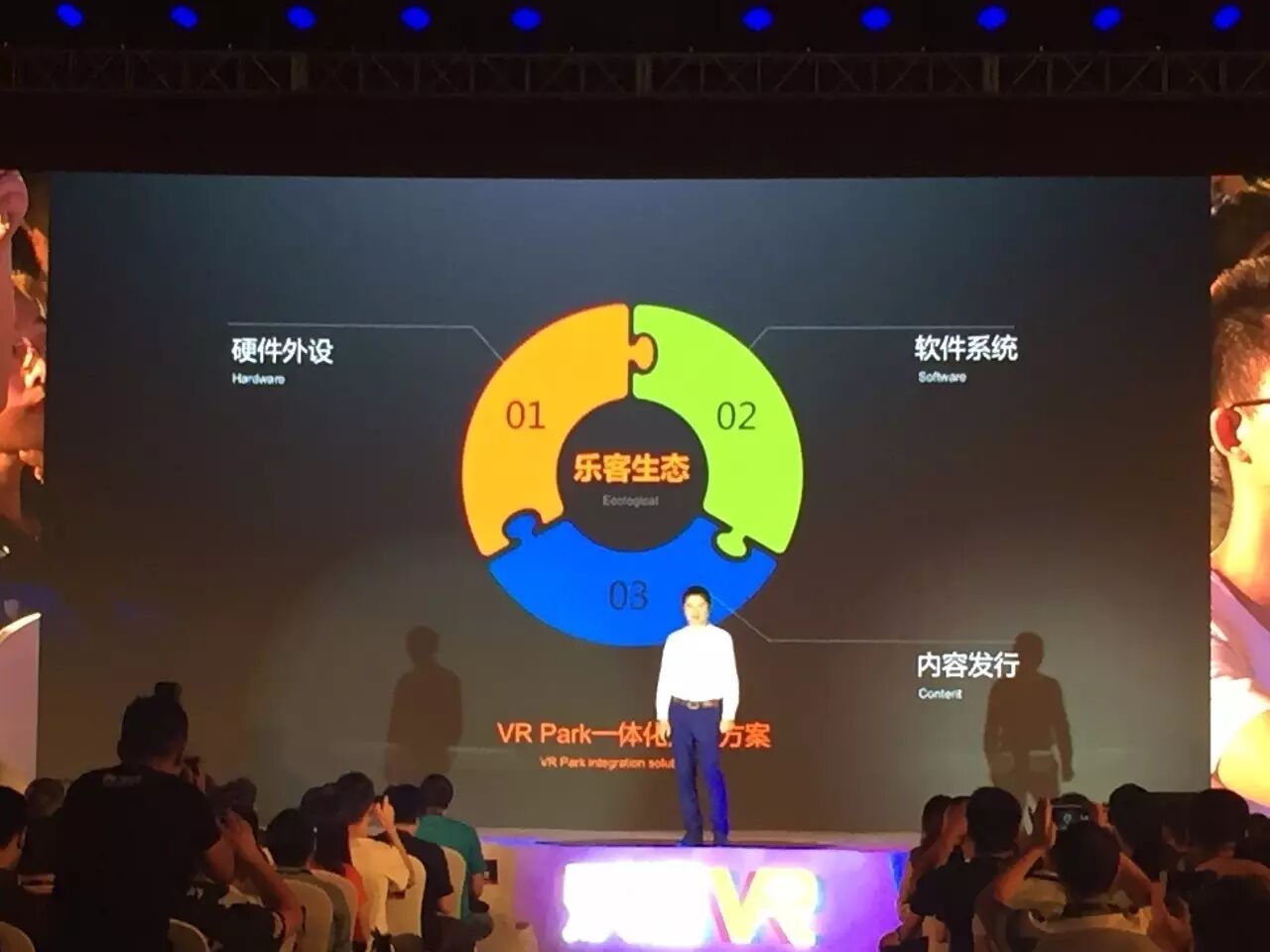 同时,在会上何文艺公布了VR Park生态。主要包括三部分,硬件外设、软件系统和内容发行,给线下体验店提供解决方案。