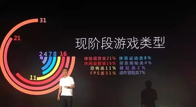 同时,杨明祥还介绍了现阶段VRLe平台上的主要游戏类型,分别为体验观赏类占21%、休闲益智类16%、恐怖类11%、FPS类31%、体育运动类8%、探索揭秘类4%、模拟类2%、动作冒险类7%。