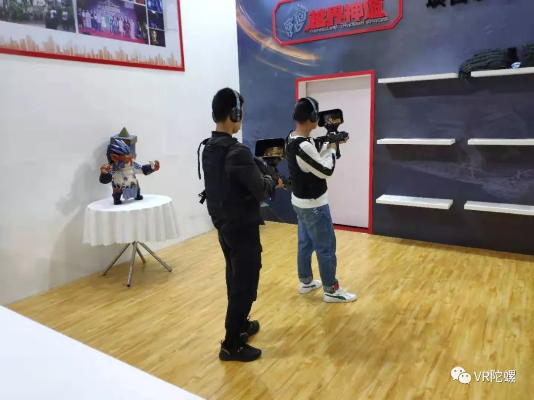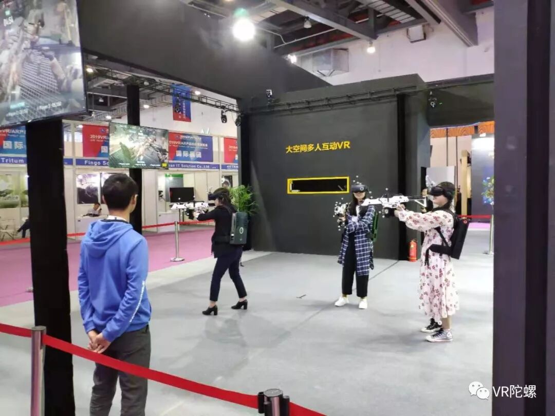 国承万通在现场展示了16个光学定位装置下的36m²的4V4对战设计。体验结合背包电脑和Oculus VR头显,实现多人沉浸对战体验。
