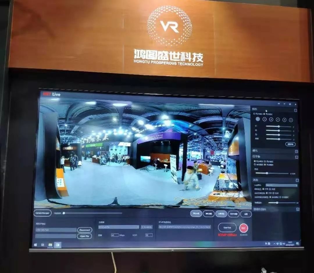 鸿图此次展示了旗下新几款全景航拍硬件方案,以及杭州米七科技有限公司的Mi7 Live全景8K直播系统。