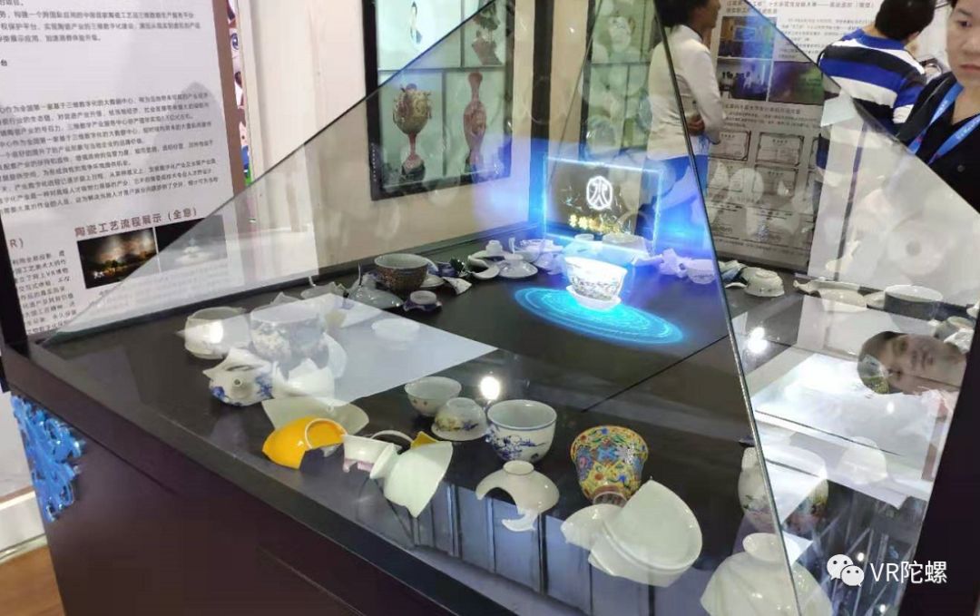 南昌工学院在16年便引入了首套VR设备用于学生的绘画教育和瓷器设计等。据悉,从15年至今该学院已获得上千个设计奖项。现场南昌工学院展示了四边菱形玻璃展柜来展示全息形象下的作品。