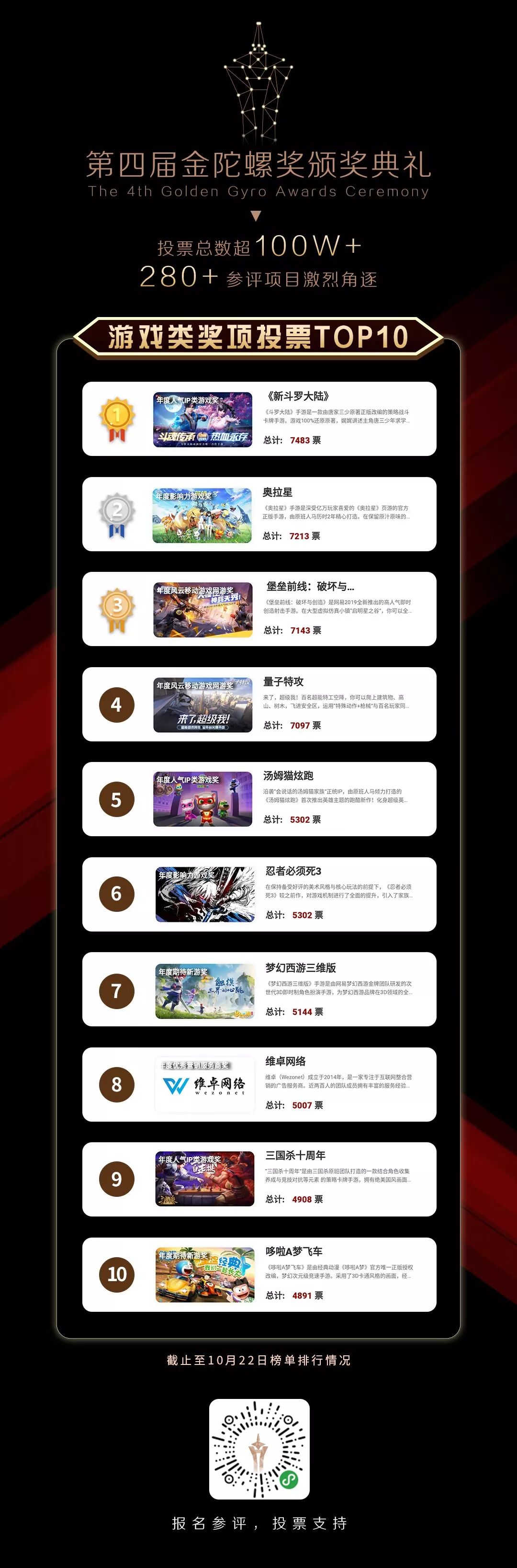 第四届金陀螺奖报名参评将于11月10日截止,目前线上投票总数已超过100W+,四大类奖项周榜TOP10实力上榜!