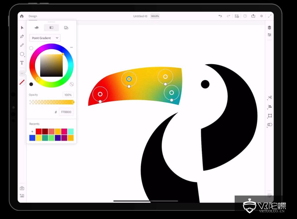 在现场演示中,Illustrator展示了一些简单的选择、绘图、形状、着色和文本工具,所有这些都可以通过iPad屏幕上的苹果铅笔轻松实现。一位艺术家将手绘的巨嘴鸟草图导入照片,通过简单的点击和点编辑,将其转换成矢量图,并毫不费力地添加了颜色和文字的径向渐变。Illustrator将在今年的Adobe Max上作为iPadOS的公共测试版提供,并在2020年正式发布。