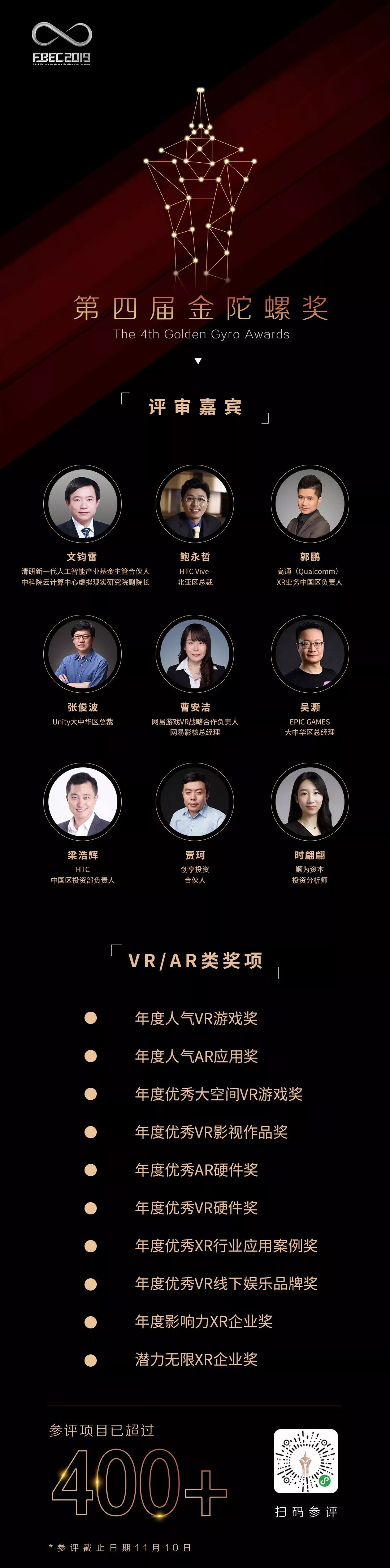 同时,第四届金陀螺奖颁奖典礼也将同期举行,目前总参评项目已超过400个,本届金陀螺奖设立10多个VR、AR相关奖项,涵盖VR、AR硬件设备、游戏、影视、大空间内容、线下娱乐品牌、行业应用、企业影响力等奖项!