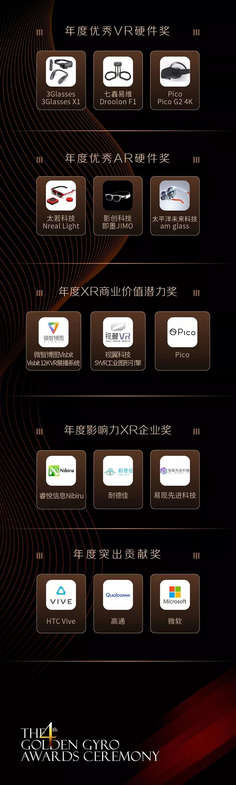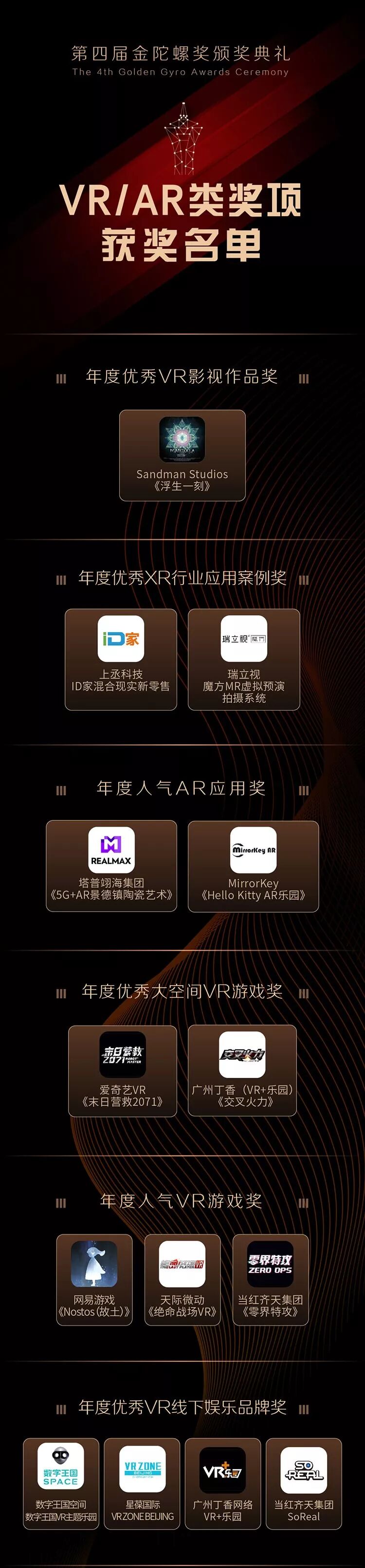 第四届金陀螺奖设置游戏、电竞、VR/AR、区块链四大奖项,奖项共计40余个,经过为期3个月的报名参评、线上投票、专家评审后,今日,第四届金陀螺奖获奖名单颁奖典礼现场盛大揭晓!