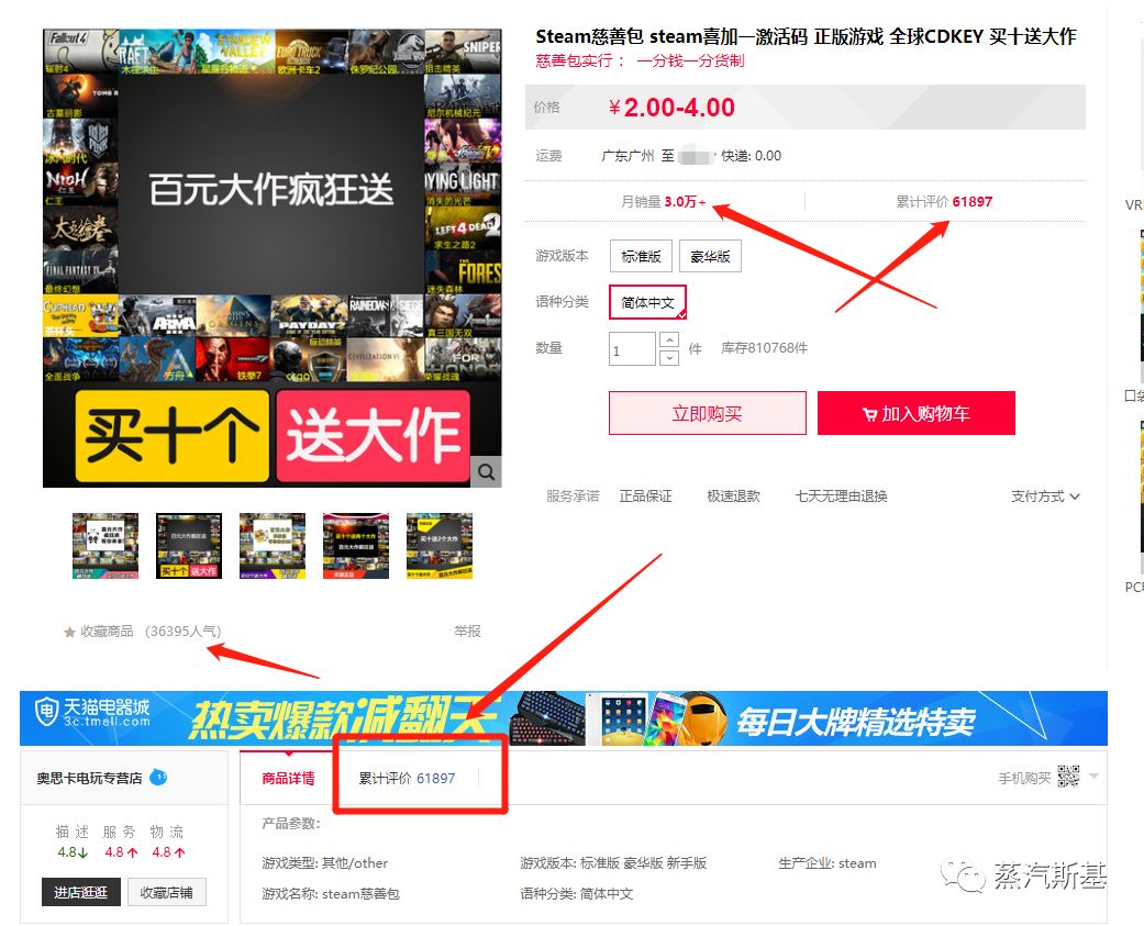 上图是随便找了一家排名不太靠前的店铺,月销量3万份!是不是觉得自己的游戏都达不到这个标准?重点是这6万多的评价基本好评居多!因为只有好评才可以获得额外的那款大作。
