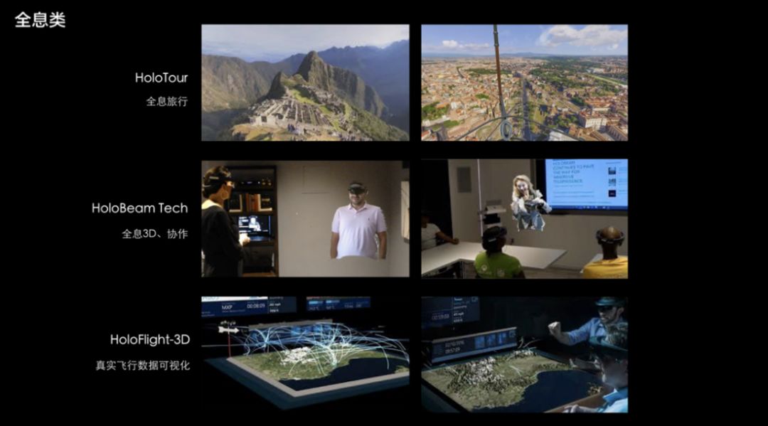 全息的包括HoloTour旅行、3D、写作、真实飞行数据可视化,这类应用也存在无法在任何时间地点使用的场景局限性。