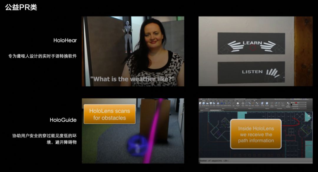 目前我们展示的是已经上架并且能够为用户使用的AR案例。其中比较好的除了有IP赋能还有轻量级游戏包括非常轻交互的互动,以及公益PR类的MR应用、AR应用,例如可以帮助聋哑人做手势翻译;在危险或者情况不明的环境帮助用户到达逃生通道;Skype全息视频电话等。但在这样一些场景时会遇到一些问题,并不是所有人在所有时间都方便进行全息通话的,因为它像视频一样,并不是所有人都能在某一个特定时间跟别人面对面。