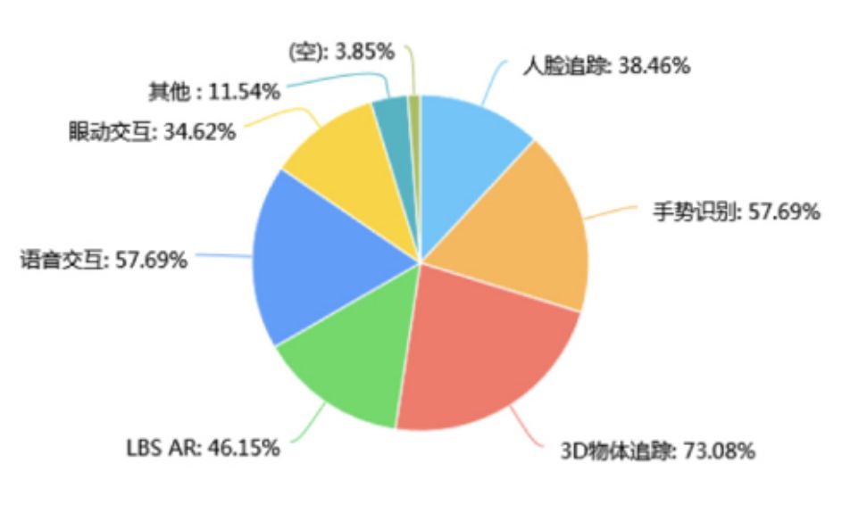 根据对开发者的调研,可以发现大家对交互的需求,包括手势识别、物体追踪、人脸识别、眼动交互等,其中3D物体追踪、手势识别、语音交互的占比都超过了50%,LBS AR占比超46%。这些数据一方面是了解开发者的需求,另外也为了SDK以及软硬件的下一次迭代做准备。