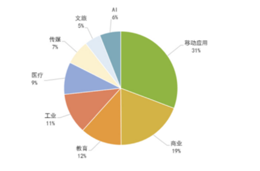 另外,从开发者内容领域分布来看,目前还是移动应用比较多,占比达到31%,商业、教育、工业的占比均在10%到20%之内。