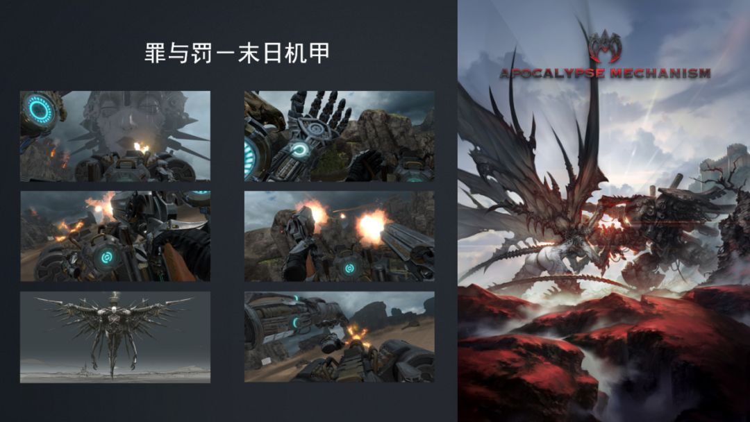 《罪与罚——末日机甲》,这个游戏讲的故事是中世纪的时候,一个巨大的机甲与一个巨大的天使之间的战争。因为没有人见过天使,我们当时说天使应该是什么样子?它应该有几个要素,应该巨大,有一部分金属,有一部分肉体,它应该华丽、邪恶,充满性暗示,最后我们就做出了这个诡异的天使。其实我相信很多人都有一个机甲梦,真正梦的是什么?不是在30层楼上开枪,梦的是你用一个巨大的手去打别人。所以,我们实现的就是这个是用你自己的手,拿手柄的手,外面是大概长五十米的机械臂,我们试图模拟了手柄和外面的这个关节的关系。