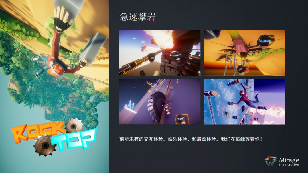 《ROCK TOP》,玩过这款游戏都觉得是对肩颈非常有好处的游戏,我们使用卡通、有趣风格,让你躲避各种各样的障碍和危险,这也是为数不多的在自己公司内部做测试的时候,大家愿意排队玩的游戏。我们以前做过各种各样游戏的人,大家有一个困惑,当让我们自己员工测试自己游戏的时候,他们不爱玩。而后来我们总结的结果是如果他们不爱玩,游戏基本上就失败了,而这款游戏他们都爱玩。我们在造梦的平台上上了一个版本,放了一个3分钟的体验版本,惊人地发现大量用户是属于一进来不断地冲值。我们测试通关是26秒,他们拍到线下有一个玩家是11秒通关,我忽然对这个游戏线上非常有信心了,这是一个非常符合C端市场的产品。