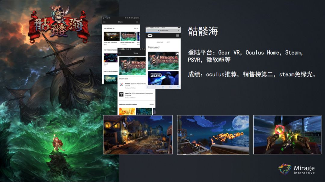 《骷髅海》获得Oculus推荐,销售榜第二,Steam免绿光。它是目前在国内上线最多的一款产品,这是一个海盗题材的游戏,覆盖了海战、射击等几种题材。