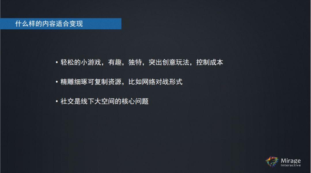 每次聊到变现,我都非常纠结,因为现在一聊变现主要是to B,但是游戏圈的人如果要变现,其实只有一条路可走,就是走to C的市场。你说变现这件事高兴也好,不高兴也罢,高兴往往是我把自己的团队养活了,但是我接的是各种各样的活,房地产的活,汽车的活,这是好事儿,活下去最重要。但是不好的方面是,你全身心地投入到这个领域中,等于是在消耗未来的一个机会。