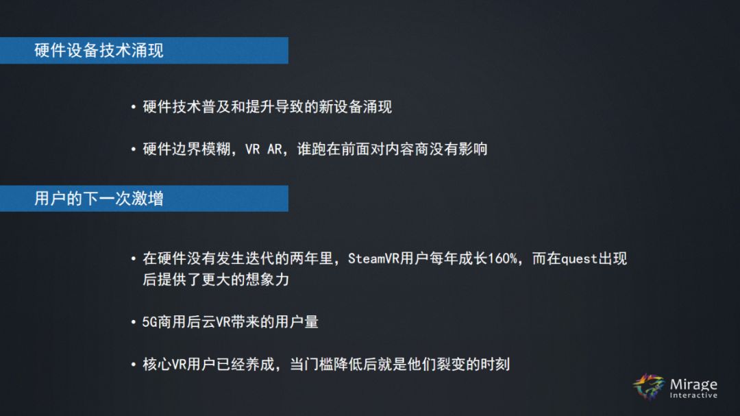 在硬件没有发生迭代的两年里,SteamVR用户每年增长160%,Quest出现后提供了更大的想象力。云VR一旦来了之后,会把门槛大大地拉近。5G什么时候普及,用户量也会彻底被放开,什么时候?一样18个月,那个时候各个城市会布满节点,运营商会以签约的形式把VR一体机送到各位的手里。