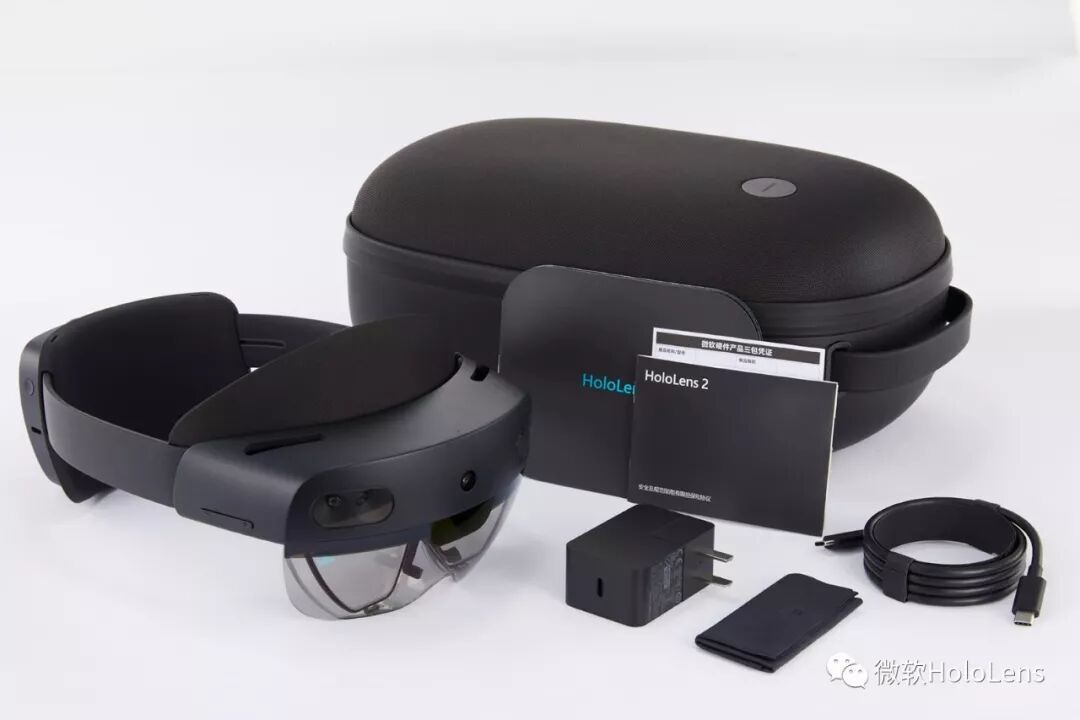 打开便携包,我们会看到除了HoloLens 2 设备之外,还有一系列配件,包括:头带,产品资料,纤维擦镜布,充电器和数据线,这些构成了它的基本配置。
