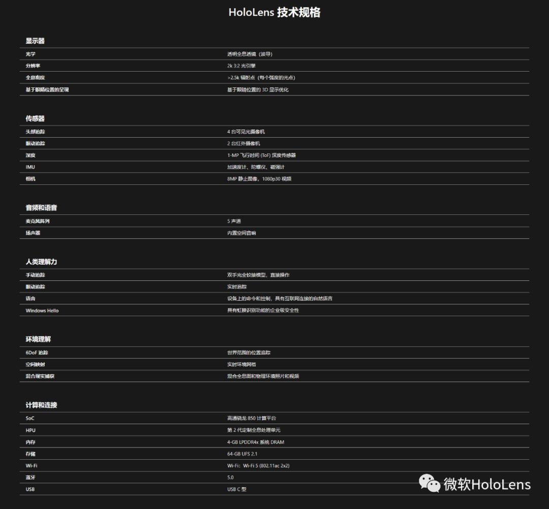HoloLens的硬件参数和技术规格展示于产品官网中,大家可以点击文末阅读原文进入页面中下部进行浏览。