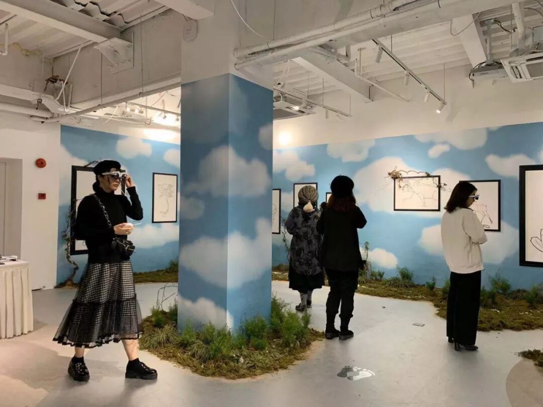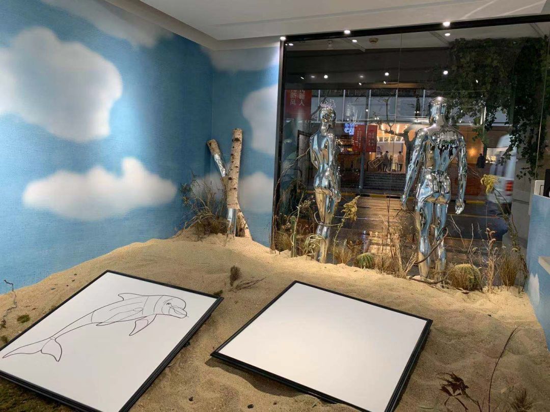 体验区的设计简单而雅致,细沙、草地、枯木搭配蓝天背景,试图呈现出伊甸乐园的景象。而挂在墙上黑白线条画是体验的亮点所在。