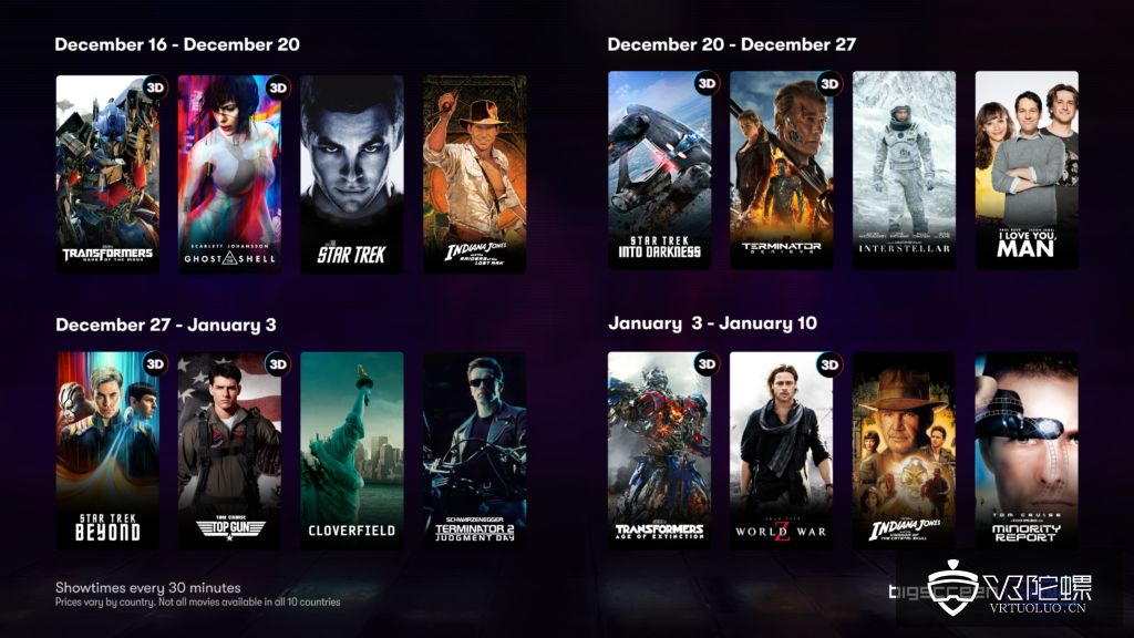 从今日起,Bigscreen每周将上架四部不同的电影,每30分钟播出一场,每张“电影票”售价3.99美元(约合人民币28元),在Bigscreen的虚拟售票厅购买。12月上映的电影有《星际穿越》和《星际迷航》系列电影。未来上映的电影还包括《壮志凌云》和《变形金刚:月黑之时》。(用户可登陆Bigscreen网站查看完整节目清单。)