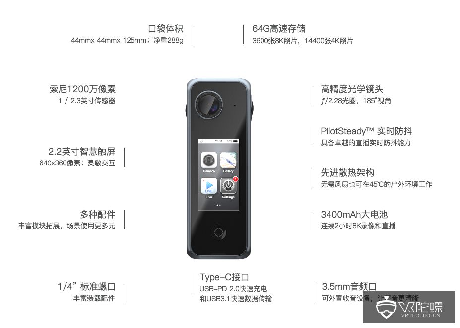 Pilot One 8K的整体的体积为44mm*44mm*128mm,整机重量为268g。拥有SONY1/2.3英寸高端传感器,达1200万像素,同时配备2.2英寸屏幕,4组高精度光学镜头,大高速存储,3400mAH电池容量支持2小时连续8K录像、直播。