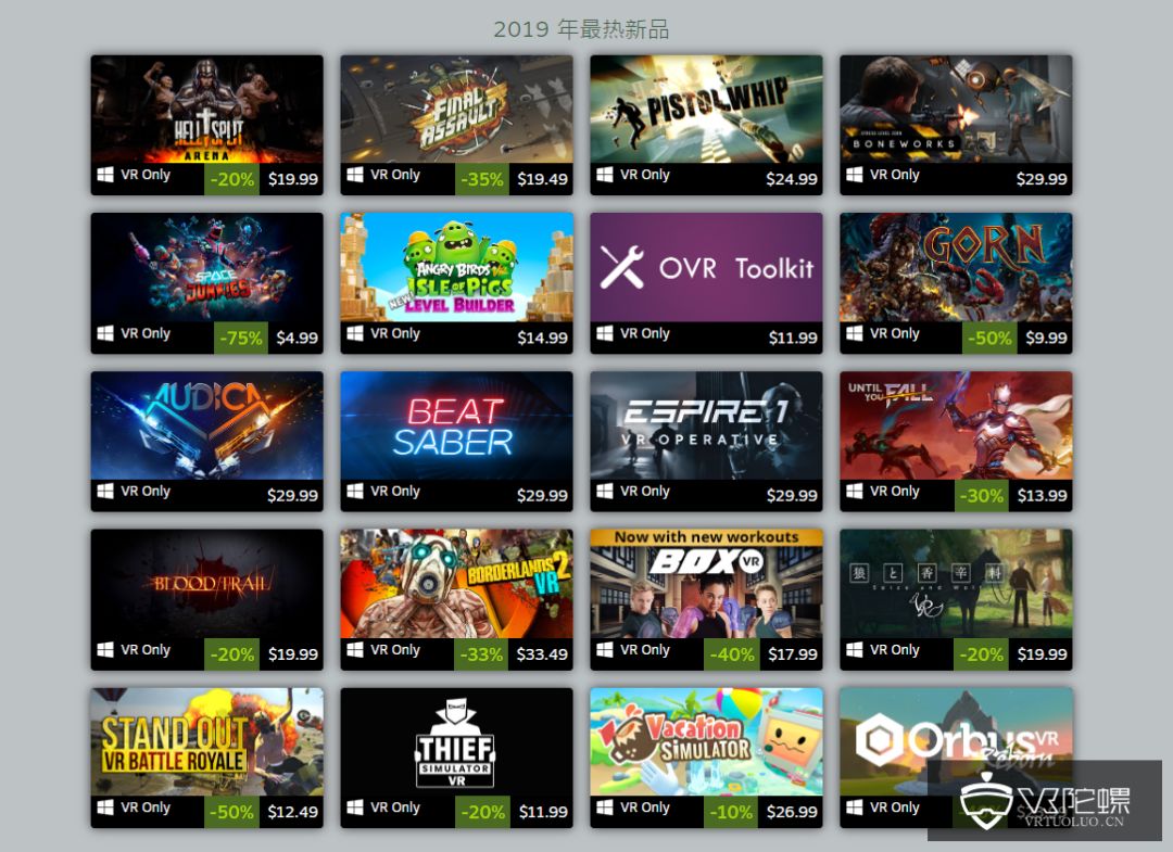 Steam今日在官网发布2019年度最畅销VR游戏评选,最畅销游戏榜单分为四个级别,分别为铂金、黄金、白银和青铜。同时最热新品游戏年度评选也出炉。