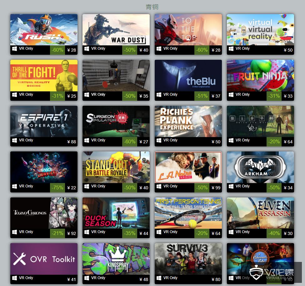 青铜级包含46款游戏,分别是:《RUSH》、《War Dust(32 VS 32 Battles)》、《To The Top》、《The Thrill of the Fight》、《Eleven Table Tennis VR》、《The Blu》、《Fruit Ninja VR》、《Espire 1:VR Operative》、《Surgeon Simulator:Experience Reality》、《Richie's Plank Experience》、《狼之香辛料》、《Spaca Junkies》、《Stand out:VR Battle Royale》、《L.A Noire:The VR Case Files》、《Batman:Arkhan VR》、《Tokyo Chronos》、《Duck Season》、《First Person Tennis-The Real Tennis Simulator》、《OVA Toolkit》、《Kingspray Graffti VR》、《SURV1V3》、《A Fisherman's Tale》、《Gun Club VR》、《Swords of Gargantua》、《Compound》、《Catch & Release》、《The Gllery - Episode 2:Heart of the Emberstone》、《Climbey》、《Thief Simulator VR》、《OVRdrop》、《Seeking Dawn》、《In Death》、《Final Assault》、《Accounting+》、《The Wizards - Enhance Edition》、《Borderlands 2 VR》、《lronWolf VR》、《Until You Fall》、《Drunkn Bar Fight》、《Dead Effect 2 VR》、《Angry Birds VR:isle of Pigs》、《Shadow Legend VR》。