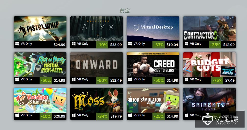 黄金级包含12款游戏应用,分别为:《Pistol Whip》、《Half-Life: Alyx》、《Virtual Desktop》、《Contractors》、《Rick and Morty: Virtual Rick-ality》、《Onward》、《Creed: Rise to Glory》、《Budget Cuts》、《Vacation Simulator》、《Moss》、《Job Simulator》、《Sairento VR》。