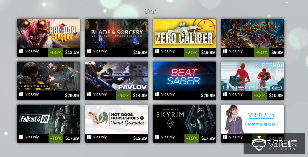 铂金级包含12款游戏应用,其中有今年TGA获奖的Beat Saber。其余分别为:《Arizona Sunshine》、《Blade and Sorcery》、《Zero Caliber VR》、《GORN》、《BONEWORKS》、《Pavlov VR》《Beat Saber》、《SUPERHOT VR》、《Fallout 4 VR》、《Hot Dogs, Horseshoes & Hand Grenades》、《The Elder Scrolls V: Skyrim VR》、《VR Kanojo / VRカノジョ》。
