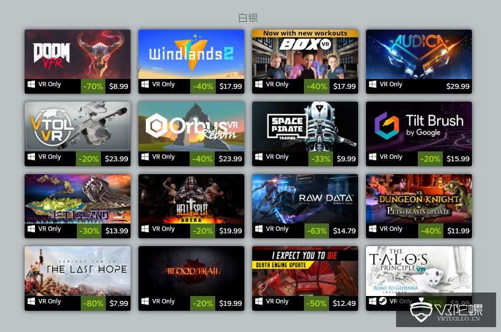 白银级包含16款游戏应用,分别为:《DOOM VFR》、《Windlands 2》、《BOXVR》、《AUDICA: Rhythm Shooter》、《VTOL VR》、《OrbusVR: Reborn》、《Space Pirate Trainer》、《Tilt Brush》、《Jet Island》、《Hellsplit: Arena》、《Raw Data》、《VR Dungeon Knight》、《Serious Sam VR: The Last Hope》、《Blood Trail》、《I Expect You To Die》、《The Talos Principle VR》。