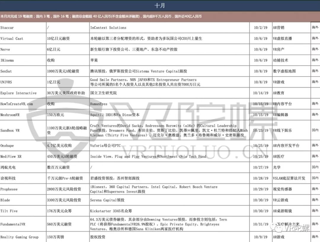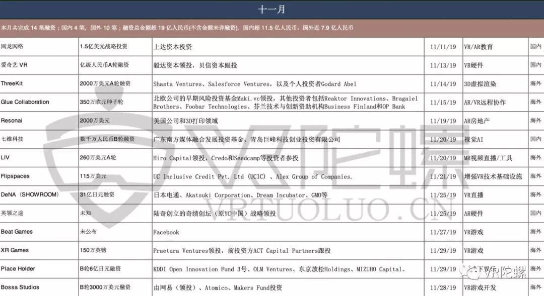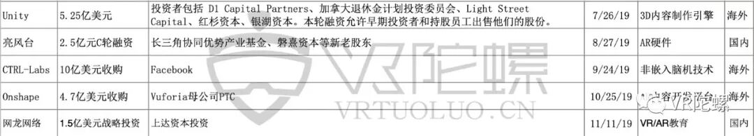 而2019年下半年四个月的融资之所以这么突出,主要依靠了四笔大额投资:七月Unity完成融资5.25亿美元、八月亮风台2.5亿元C轮融资、九月CTRL-Labs被Facebook以10亿美元收购、十月Onshape以4.7亿美元价格被PTC收购、十一月网龙网络的1.5亿美元战略投资。可见,2019年的海外资本是VR/AR市场的主力军,依旧支撑着2019下半年的融资金额增长,但是国内融资也在一路发展,相比2018年,国内融资市场活动更加活跃。