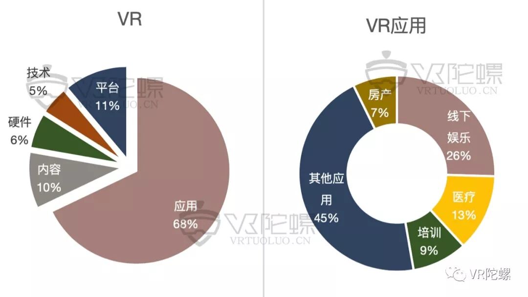 VR总体在市场占比40%,而在VR领域中,VR应用占68%,共55笔。其中最突出的是VR医疗和VR线下娱乐。线下娱乐部分获得14笔融资,在VR应用中占比26%;而医疗应用则获得7笔,占VR应用13%。其中,VR线下娱乐在上半年获得3笔亿级投资,下半年获得1笔亿级融资:Sandbox VR年初的6800万美元融资、Meow Wolf的1.59亿美元融资以及西瓜互娱的1.5亿元人民币融资;再加上下半年The Void融得2000万,因此VR线下娱乐共获得超过20亿的融资。相比上一年VR应用着重教育培训,今年瞄准VR线下娱乐表明VR领域的市场目标已经从B端往C端转移。与此同时,应用中医疗(13%)、培训(9%)、房地产(7%)也保持着一贯态势,变动较小。