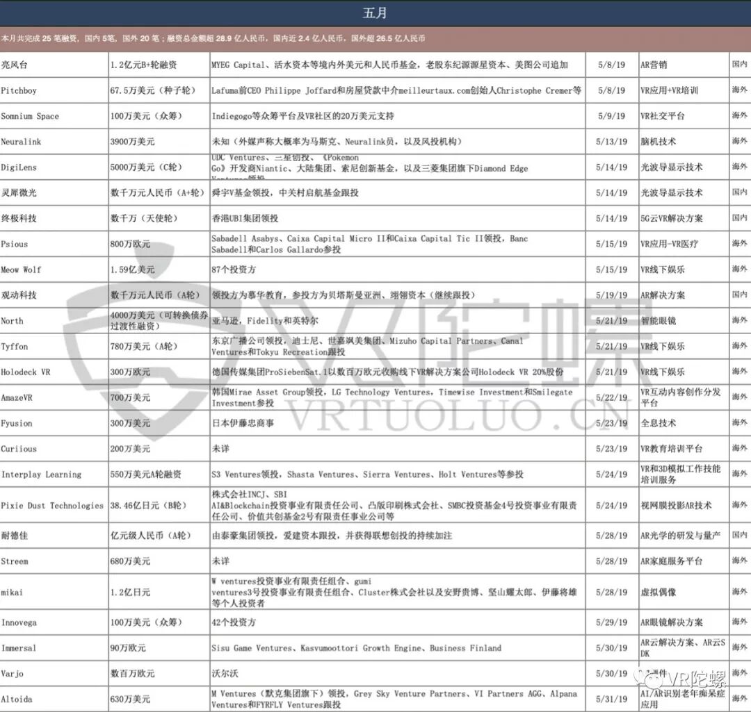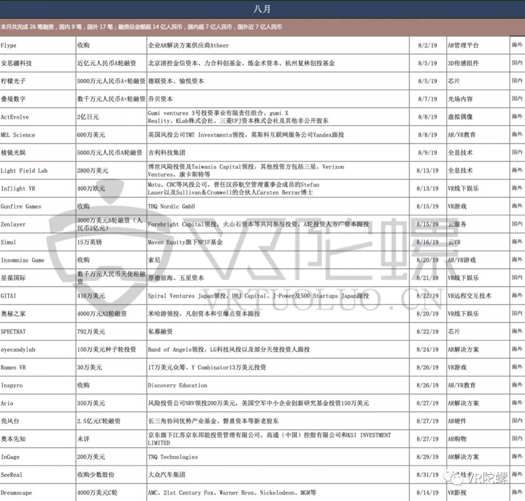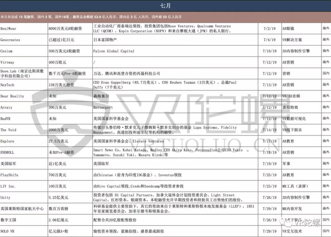 在七月,Unity获得5.25亿美元融资,同月数字王国配售共2.06亿港元股份,以及NOLO VR获得的A+轮亿元级融资,一共为39亿。同时还有The Void的2000万美元融资和RealWear的8000万美元B轮融资,使七月的总融资额飙升为53.8亿元人民币。