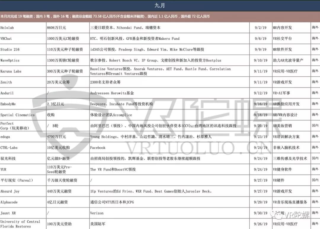 九月份的海外高峰离不开一件事,Facebook宣布以10亿美元收购脑机技术初创公司CTRL-Labs。虽然国内驭光科技有一笔亿元级别的B+融资,日本公司EmbodyMe也获得亿元融资,但是因为CTRL-Labs这笔收购投资量级过于庞大而显得微不足道。而这10亿美元约70亿人民币也是九月最主要的支撑。