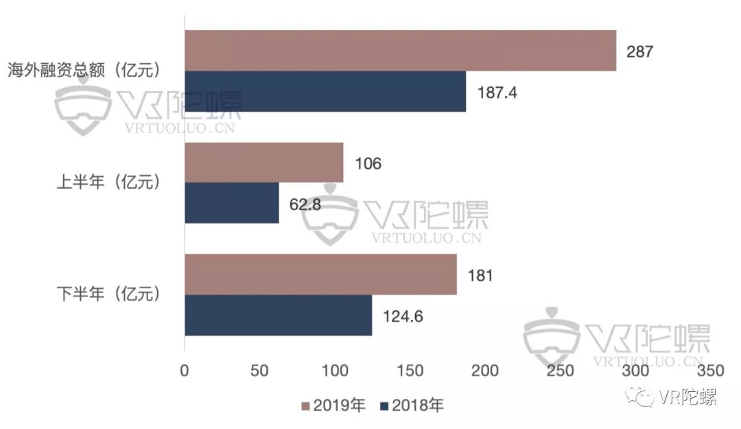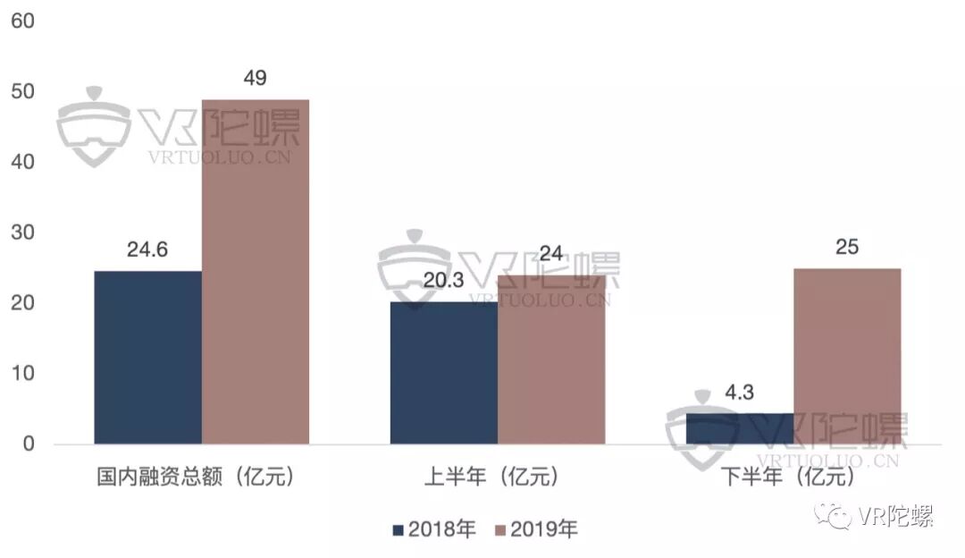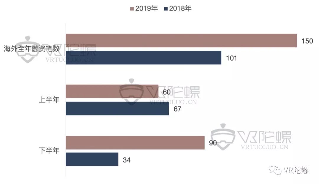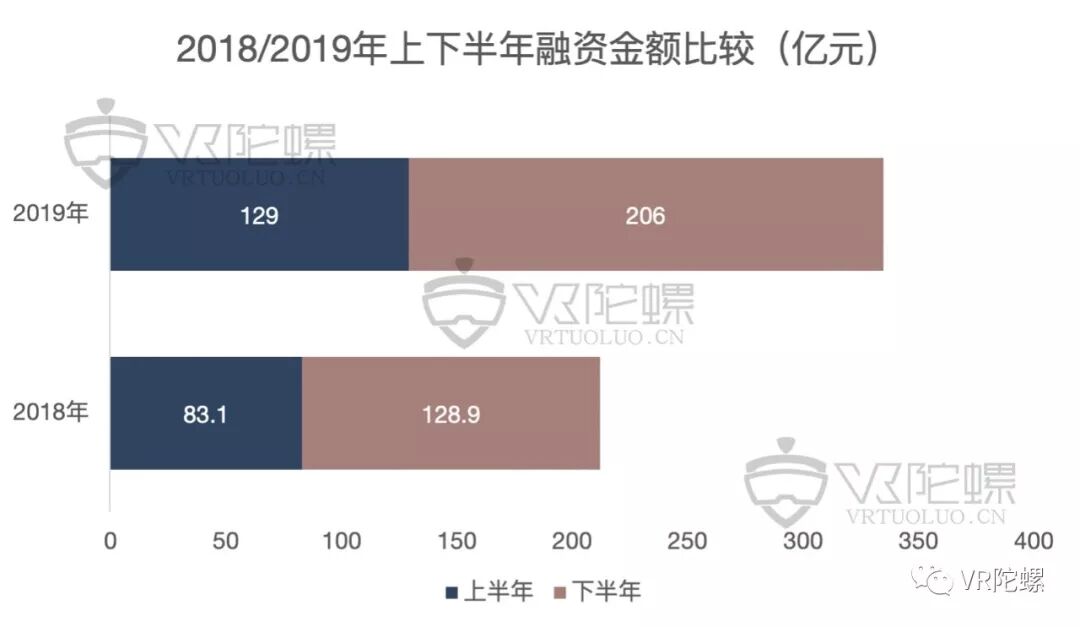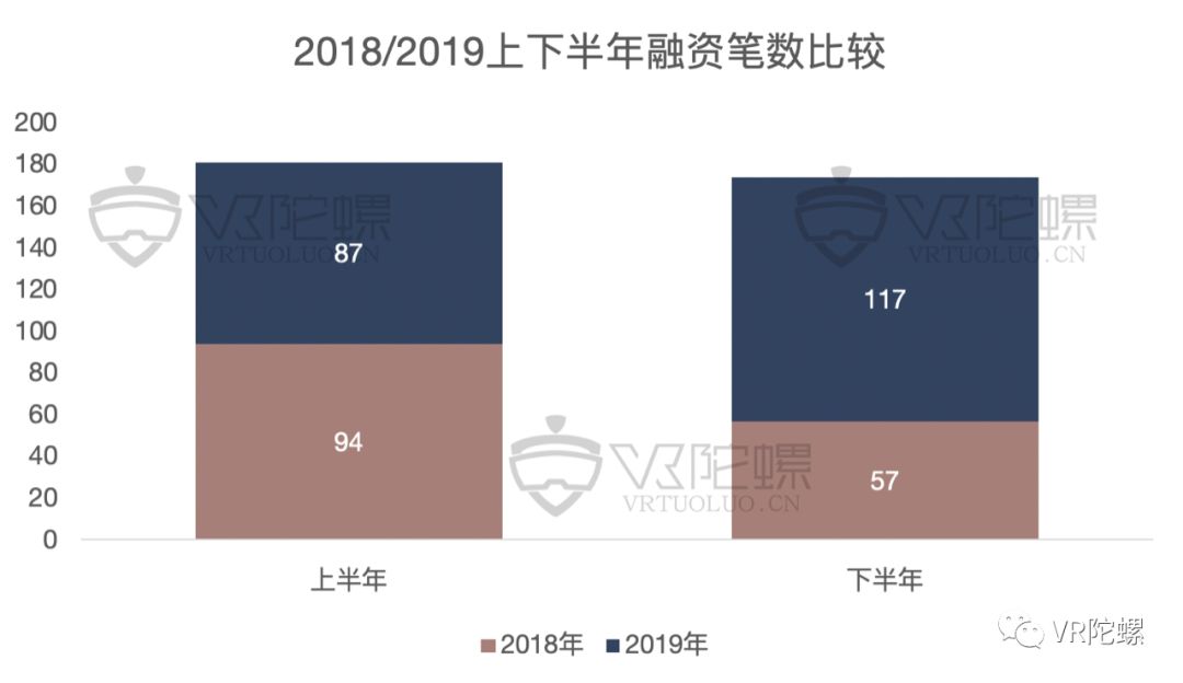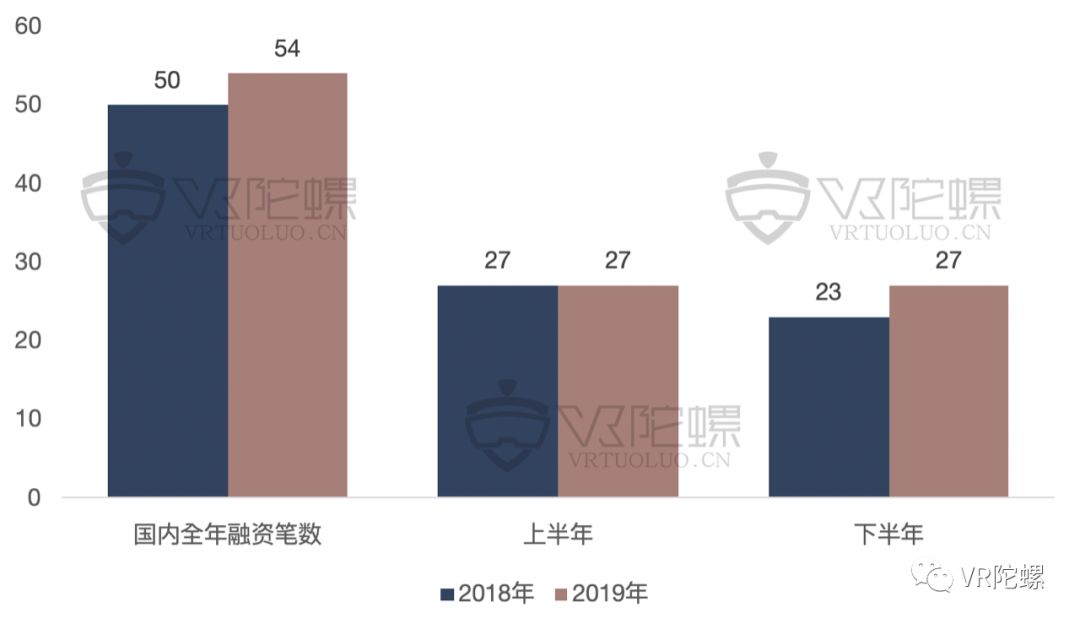 而融资笔数来看,2019年与2018年一样冷清。国内全年总融资数为54笔,比2018年多4笔。而上半年下半年均分笔数,各27笔投资数。上半年的融资数目与2018年同期相同,下半年也仅比2018年多了4笔。在投资数只增长了4%的情况下,2019年的国内总投资额却增长了99%,这说明国内的投资更加集中,更专注深入拓展VR/AR行业。
