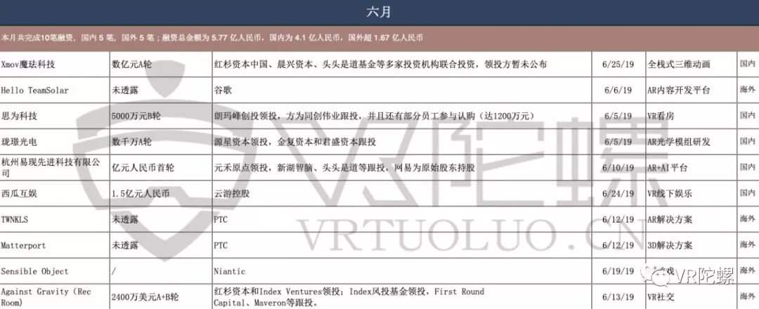 而六月融资共10笔,海外5笔。但是除了Against Gravity的2400万美元融资是已经确认的,其他四家都未透露具体金额,因此六月海外融资额较低。