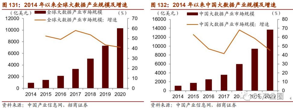 2014年以来,大数据产业市场规模不断扩大。中国产业信息网数据显示,2014年全球大数据产业规模920亿美元,其中中国大数据产业规模1038亿元。到2020年大数据产业规模预计增长超10倍,全球规模达10270亿美元,相比2014年增长10.16倍,中国大数据产业市场规模达13636亿元,增长12.13倍。