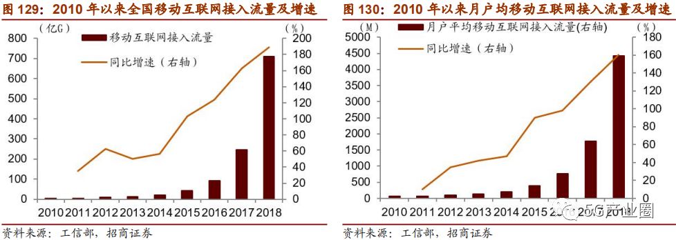 工信部数据显示,2015年移动互联网接入流量达41.87亿G,同比增长103%,月户均移动接入量达389.3M,同比增长89.9%。截止到2018年底,我国移动互联网接入流量达711亿GB,同比增长189.1%,全年月户移动互联网接入均流量(DOU)达4.42GB,比上年增长1.6倍。