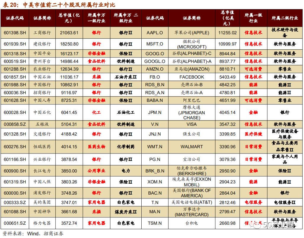 随着5G开启新一轮大科技周期,全球加速对5G部署,目前我国5G发展正处于世界领先水平。但从我国A股公司市值来看,目前还未有科技公司跻身前二十。而美国市值最大的前五家公司中有四家属于信息科技行业。对比美股龙头公司行业分布,我们认为经济结构的转型背景下,我国主导5G必然带来行业结构的调整,未来A股有望出现万亿级别的科技公司。