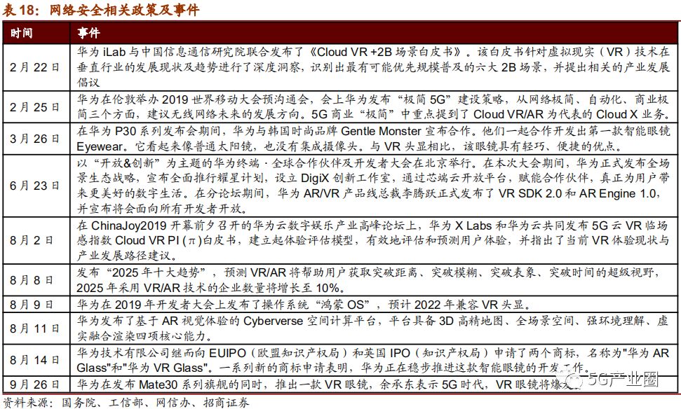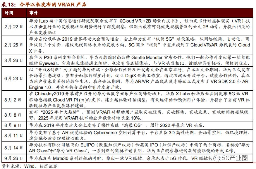 2018年以来,包括华为、微软、苹果、谷歌等全球巨头争相加码AR/VR市场,19年进入新品发布期,全年国内外厂商发布10余款AR产品,华为在10月份发布的VR Glass新品性能大幅提升。