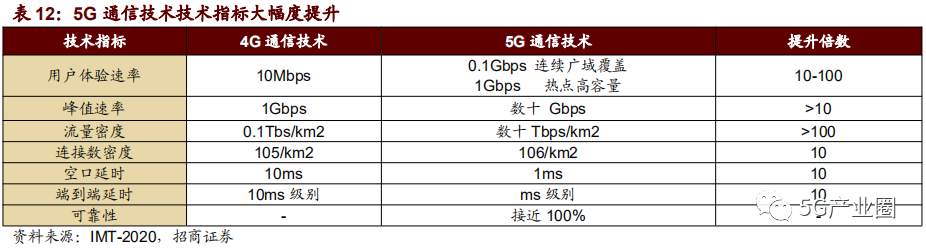 5G技术一方面解决了AR/VR大带宽+低延时的最大短板。高质量VR/AR业务对带宽、时延要求非常高,对于 VR来说,要达到非常好的用户体验,需要的带宽要达到1000Mbps以上,延时要达到小于2ms的级别,而对于AR来说要达到不错的用户体验也需要200Mbps带宽以上和5ms以下的延时,这在4G时代是没有办法实现的,唯有5G能满足这样的高速传输能力。