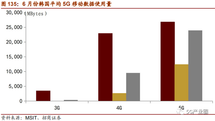截止到2018年底,我国全年月户移动互联网接入均流量(DOU)是4.42GB。参考韩国2018年12月底开启5G商用之后的数据流量来看,今年6月份韩国平均5G移动数据使用量达到24GB,同期4G用户平均使用量为9.1GB,随着5G商用的到来,平均月户流量超过20GB将不会太远。