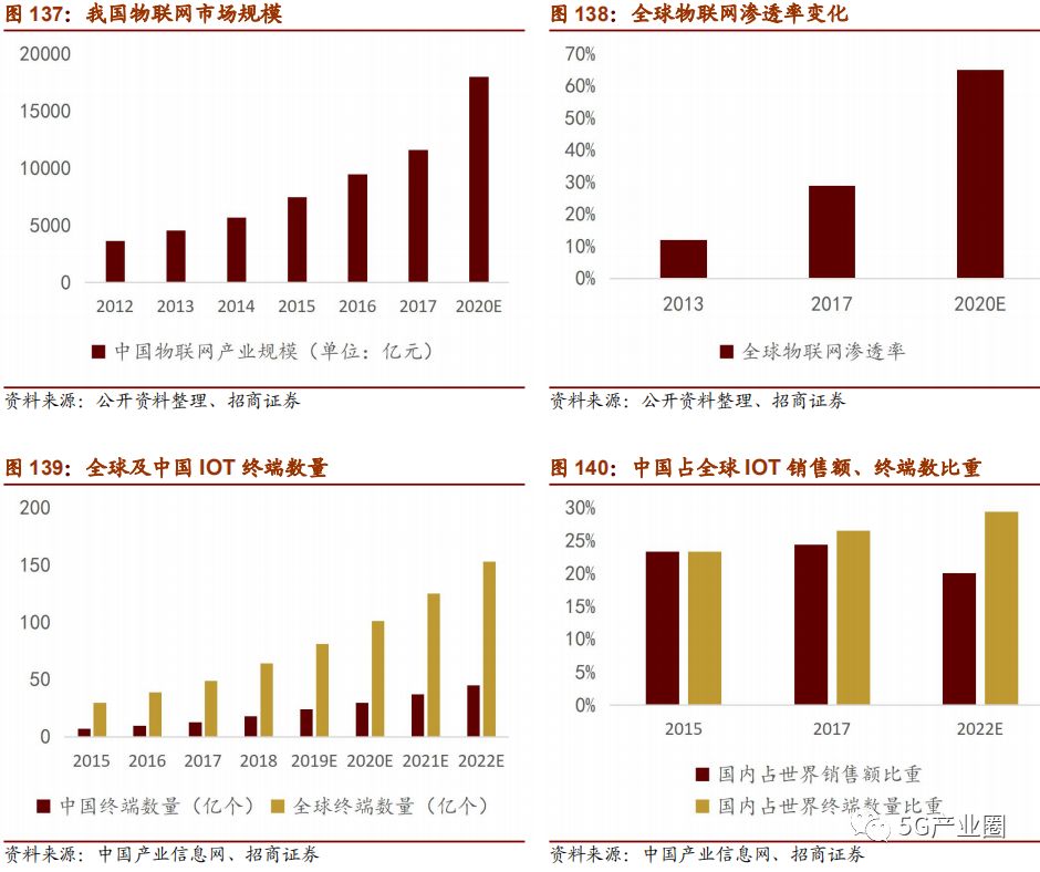 中国作为全球最大的物联网市场,占有22%的市场份额。而且至今,中国很多M2M(Machine to Machine)仍然采用传统的B2B的方式,但是我们认为随着5G和数据分析等新电信技术的普及和发展,确保了中国在全球的领先地位,物联网的市场增速远高于工业增速,预计2020年的年增长率将在20%-30%之间。
