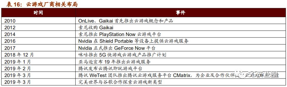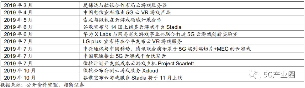 5G时代,通信带宽变大,延迟变低,云游戏的核心瓶颈问题将被解决。游戏资源都将在云厂商的云端服务器中运行,用户只要需要拥有高配的显示器,不需要下载任何游戏资源,就可以在用户端操控云主机接收从云主机实时传回来的游戏画面,而5G超高的网速,将会带给用户更好的体验。今年以来国内外云游戏厂商纷纷布局。