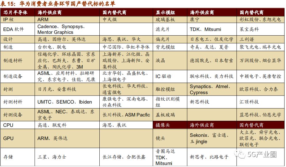 此外,目前国产替代比率较大的有指纹识别芯片,和摄像头CIS,FPGA领域,紫光同创已经进入华为产业链,开始从低端产品的替代,高端产品正在研发中;零部件供应商来看,国产厂商比例也在增加。其中面板有京东方、TCL;指纹芯片有汇顶科技、兆易创新;天线有鹏鼎控股、信维通信等。