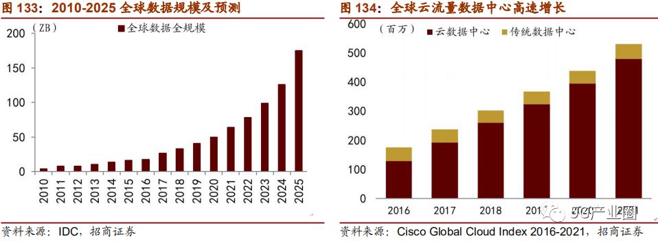 另一方面源于大数据和物联网数据的爆炸增长。至2021年,储存在数据中心的数据相对于2016年将增长4.6倍至1.3ZB,年度复合增长率达36%,存储在设备中的数据将达到5.9ZB。由于物联网的推动,2021年全球生产的数据总量将达到847ZB,2016年为218ZB。